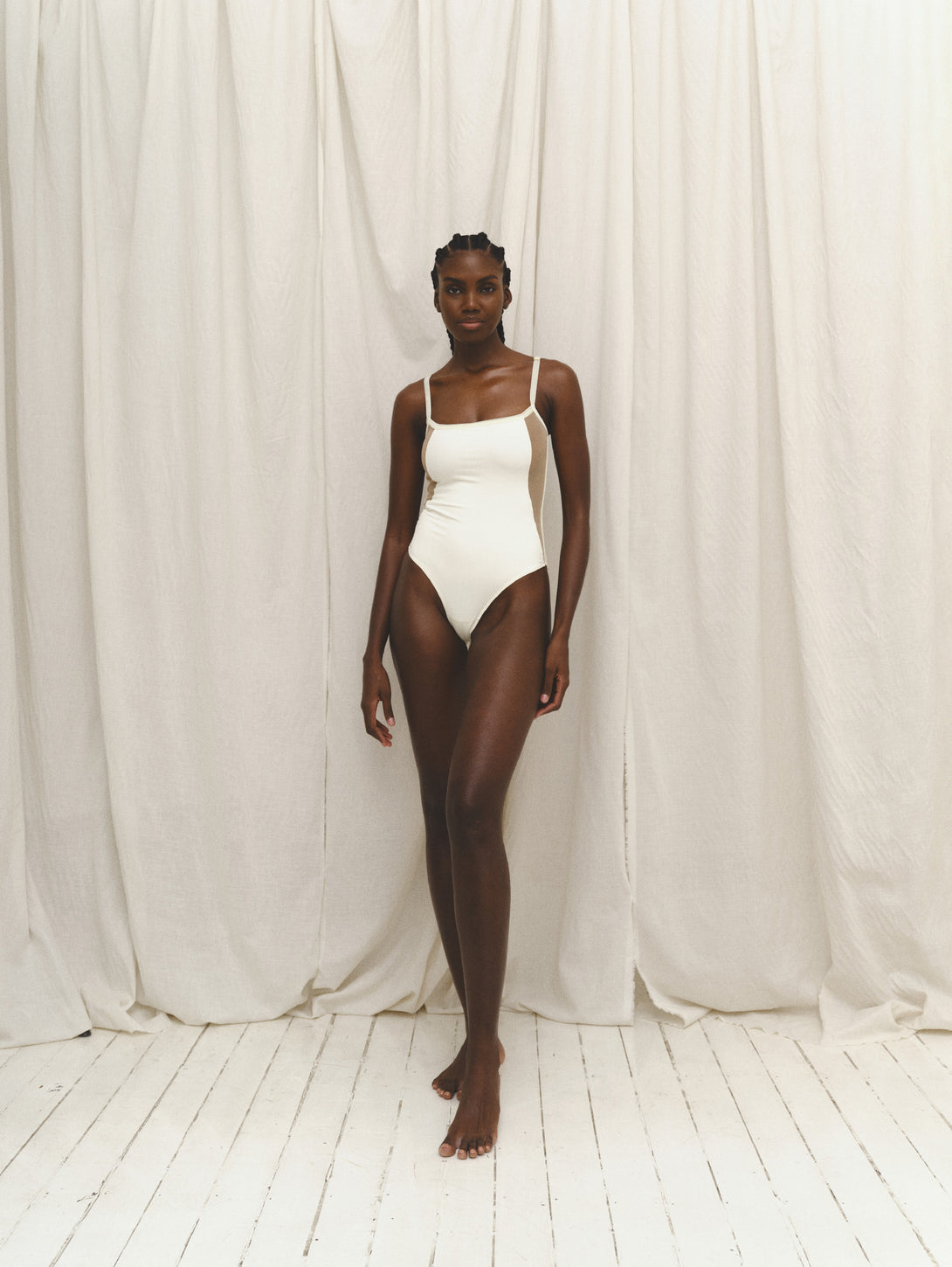 Body in a combination of microfiber made from biodegradable fibers and Italian mesh on the sides, straight neckline, adjustable tactel elastic strap, cotton gusset.