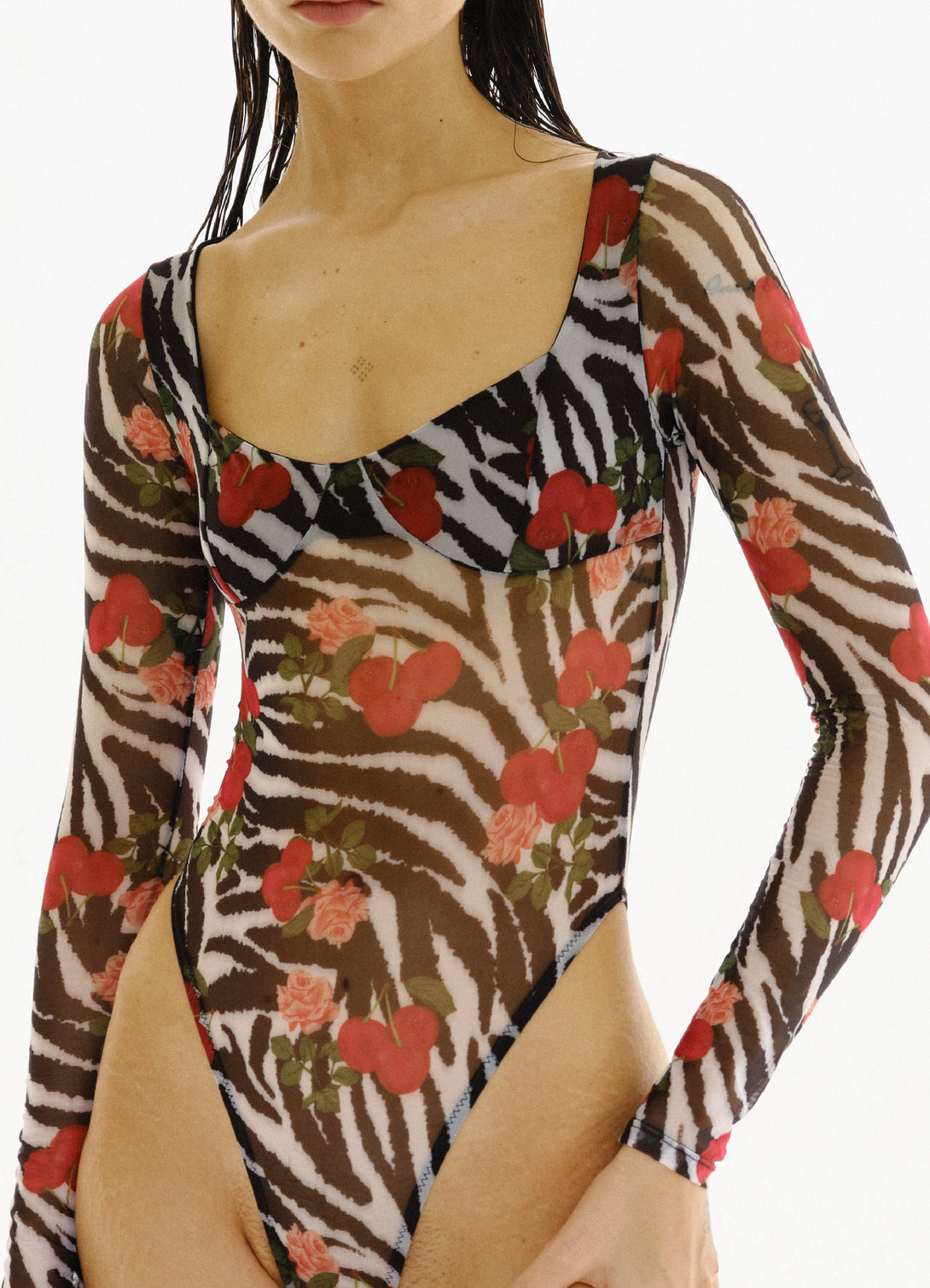 slim elastic leg, cotton reinforcement and deep neckline.